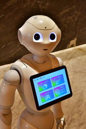 TOKYO, JAPAN - APR 13, 2018 : Pepper Robot Assistant Humanoid with blank screen Fighting Action