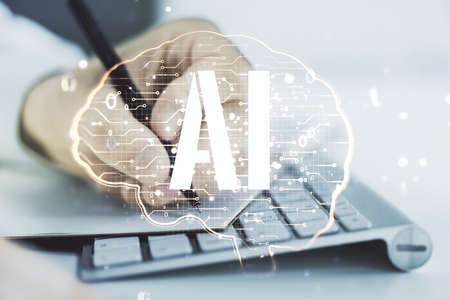 Creative artificial Intelligence symbol concept with modern laptop on background. Multiexposure