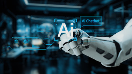 A robotic hand engages with an AI chatbot interface, showcasing advanced technology and interaction. The dynamic setting highlights innovation and digital communication.