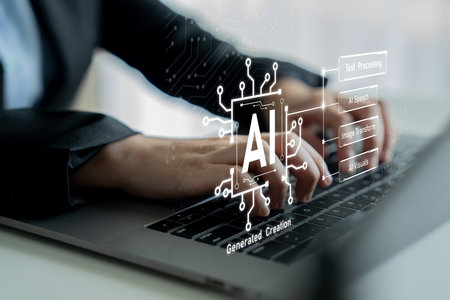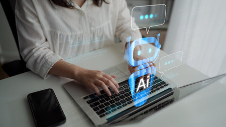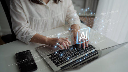 Technology and people concept women use AI to help work, AI Learning and Artificial Intelligence Concept. Futuristic technology transformation.