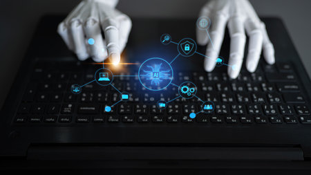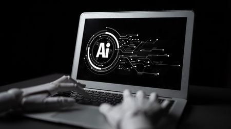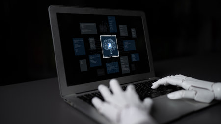 A robotic arm interacts with a laptop in a modern workspace, showcasing the integration of technology and innovation in everyday tasks and future advancements in robotics.