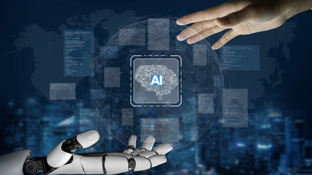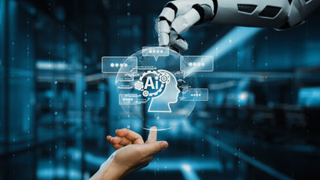 artificial intelligence Businessman using AI smart robot technology inputting commands to analyze data and build something. future technology changes. Chatbot chat AI concept