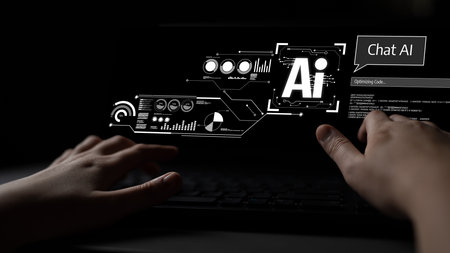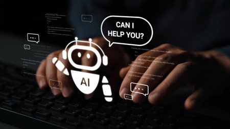 Friendly AI chatbot offering assistance while user interacts with keyboard in dark setting, symbolizing technology and communication in modern life.