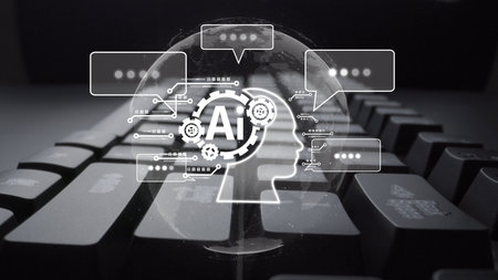 AI artificial intelligence digital chatbot conversing with a customer. Image enhanced with futuristic graphics.