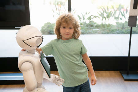 kid and robot assistant with information screen in protective mask. robotic pandemic future