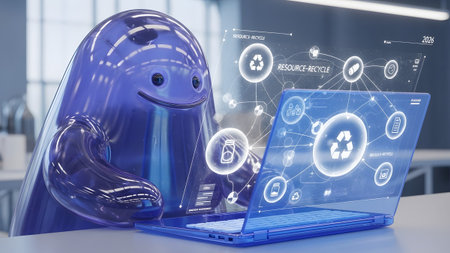 A translucent blue amorphous character looks at a holographic laptop screen displaying a glowing...