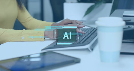 Close up of hands using laptop with abstract glowing AI chip on blurry background. Artificial intelligence and innovation concept. Double exposure