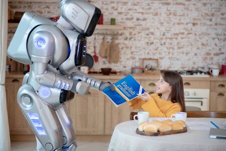 English grammar book. Robot giving english grammar book to a girl sitting at the table