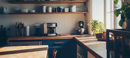 Cozy kitchen with retro decor and colorful utensils in sunlit room. That the image is generated using AI.