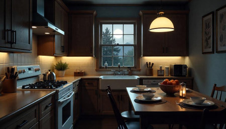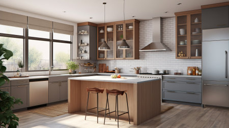 Warm kitchen gathering modern home interior design bright atmosphere wide angle culinary joy