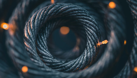 A tightly coiled rope with orange lights shining through in a dark setting.