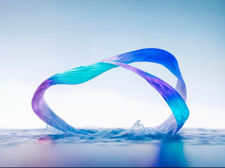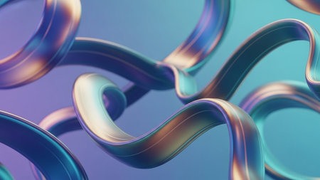 Metallic showing iridescent twisted ribbons with metallic sheen on a soft blue and purple gradient background. resolution
