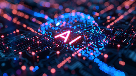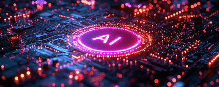 AI circuit board with glowing red and blue lights