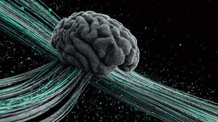 A brain model placed amid dynamic data streams, showing the intersection of neuroscience and technology in a modern digital landscape.