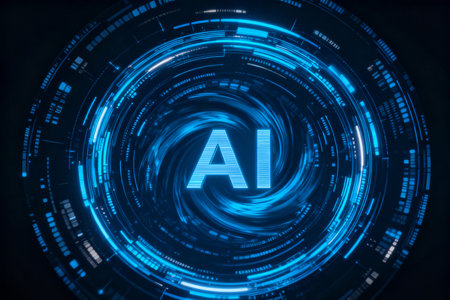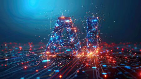 Glowing blue ai letters emerging from a digital, abstract surface