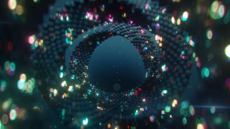 Rings of glitching spheres. Abstract sci-fi futuristic visualization. 3D render