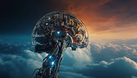 futuristic robotic head, artificial intelligence, brain concept, colorful abstract background, high tech design, innovation, digital art, science fiction elements, profile view, vivid colors