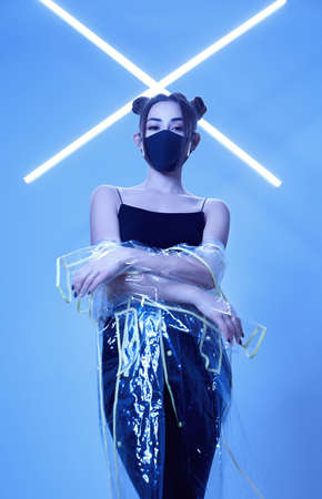 Portrait of beautiful virus mask Asian woman wearing face protection and raincoat around colourful bright neon uv lights posing in studio