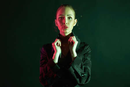 Portrait of a beautiful elegant girl in a beret and suit. Photo in neon style.