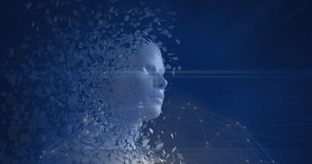 Composition of exploding human bust formed with particles and network of connections. global connections, data processing and digital interface concept digitally generated image.
