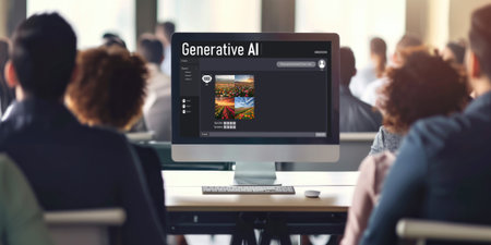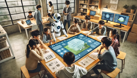 Students in a cutting-edge classroom, showcasing Human-AI collaboration tools for innovative learning.