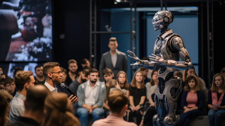Presentation of a robot with AI at a conference in front of people