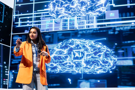 Cheerful engineer talking at AI tech summit event gathering professionals seeking to discover latest AI solutions. Upbeat speaker presents how can AI be leveraged to accelerate innovation