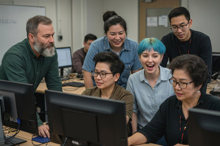 A diverse team of software developers collaborating on a project, programming together on desktop computers. Working together on a project, sharing ideas and experiences in a dynamic office environment. AI Generated