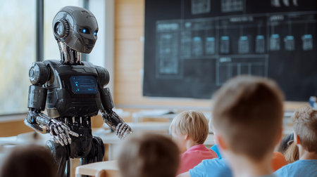 An interactive robot engaging with young students in a classroom, reflecting modern educational tools and learning experiences