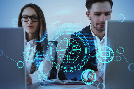 Technician and colleague use AI cognitive computing to extract information from complex data on laptop. Close up of teamworking IT experts using artificial intelligence on notebook