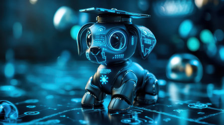 A cute and futuristic robot dog with a graduation cap, posing with digital elements around, symbolizing achievement in a tech-filled world.