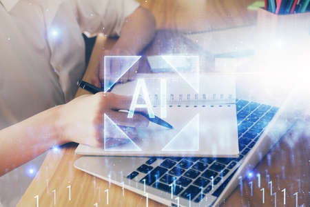 Double exposure of creative artificial Intelligence icon with hand writing in notebook on background with laptop. Neural networks and machine learning concept