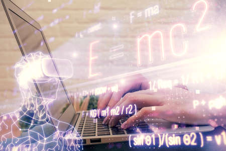 Double exposure of woman hands typing on computer and formula hologram drawing. Education concept.