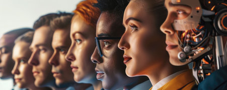 The picture of the group of the people and robot that standing next to each other that come from the various jobs, the different race gathering together that stand for the unite and teamwork. AIG43.
