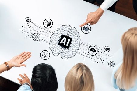 A diverse group of professionals engages in a dynamic discussion centered around artificial intelligence concepts illustrated on a tabletop, fostering creativity and collaboration.