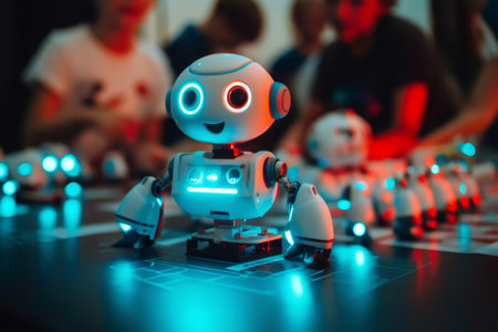Small white robot with glowing eyes standing on interactive table during robotics workshop with blurred students and teachers in background