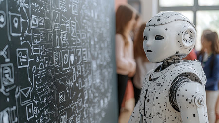A humanoid robot stands in a classroom setting, engaging with a digital wall covered in abstract symbols, representing innovation in education and technology.