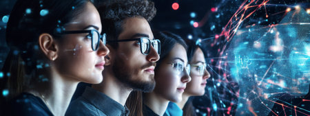 Group of people focused analyzing digital data on futuristic screens, AI generated