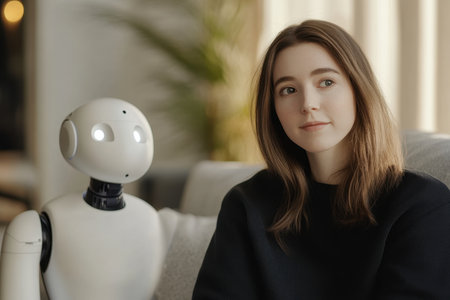 A friendly robot sits next to a young woman in a cozy living room, creating a warm atmosphere with natural light.