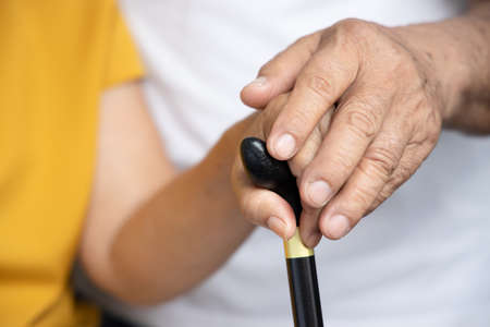 Close up granddaughter takes care of the health sick grandmother at home by holding hands. Lifestyle support the love of the family.