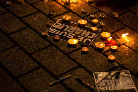 BERLIN, GERMANY - JANUARY 7TH, 2015: March against Charlie Hebdo magazine terrorism attack, on January 7th, 2015, in front of France Embassy in Berlin, Germany