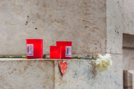 Memorial burning candles in red lanterns on granite slabs. For Hallowmas and All Saints day.