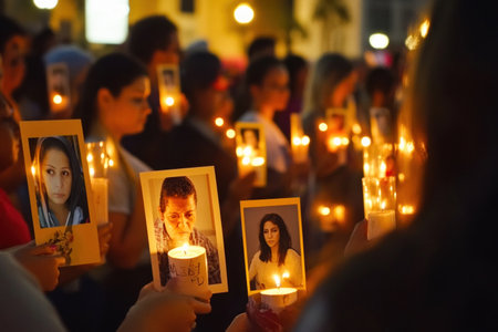 Crowd holding candles and photos of people while commemorating a tragic event during a vigil