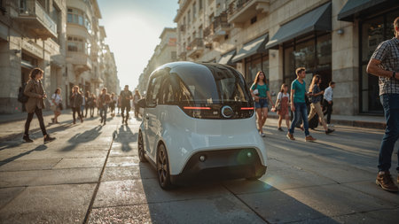 Modern compact electric vehicle navigating a bustling city street with pedestrians walking on both sides. Urban architecture and sunlight in the background.
