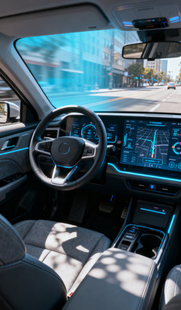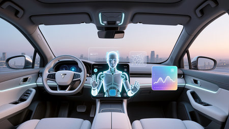 A futuristic car interior showcases advanced AI features, blending technology and design.