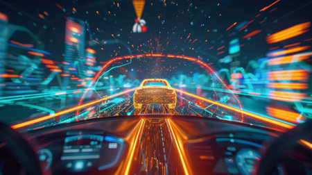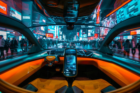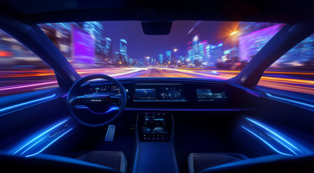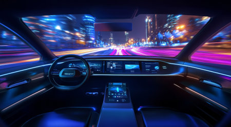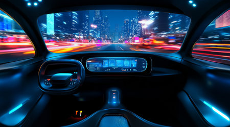 Futuristic interior of an autonomous vehicle driving through a city at night, with a digital dashboard and vibrant, blurred city lights in the background. Concept of advanced technology.