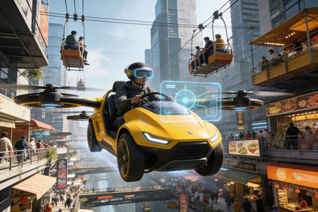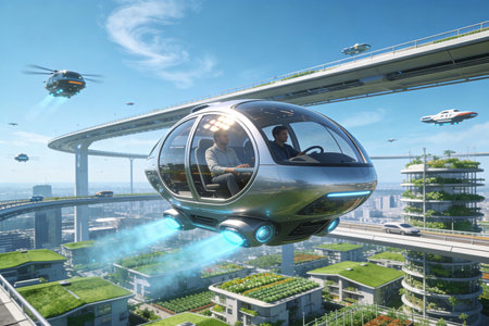 A dynamic cityscape showcasing sustainable commuting solutions with electric vehicles hyperloop station flying cars and autonomous vehicles Embrace the future of transportation