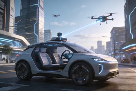 An autonomous vehicle glides through city streets, demonstrating onboard AI systems managing its navigation and movement.