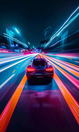 extremely fast futuristic sports car driving highway on high speed, luxury sport auto blurred motion on illuminated city street, rear back view video game. High quality photo