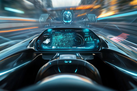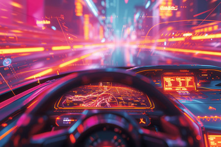 High-tech car dashboard with holographic interface and neon lights